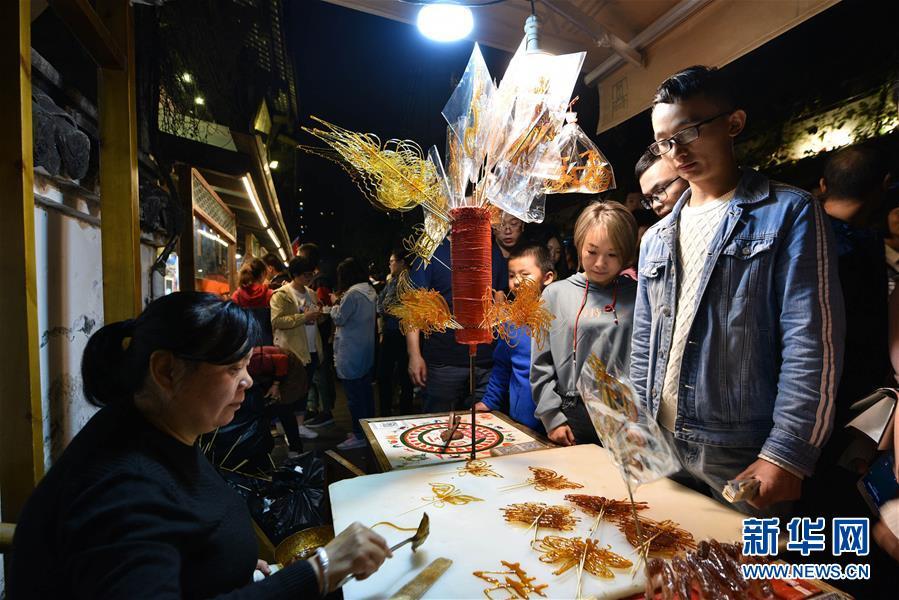 10月4日,游客在宽窄巷子观看糖画的制作。国庆假期,众多游客来到四川成都宽窄巷子参观游览,体验巴蜀文化,品尝传统小吃。 新华社发(吕明泽摄)