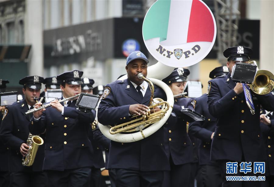 10月8日,在美国纽约曼哈顿第五大道,纽约警察乐队参加哥伦布日游行。 新华社记者王迎摄