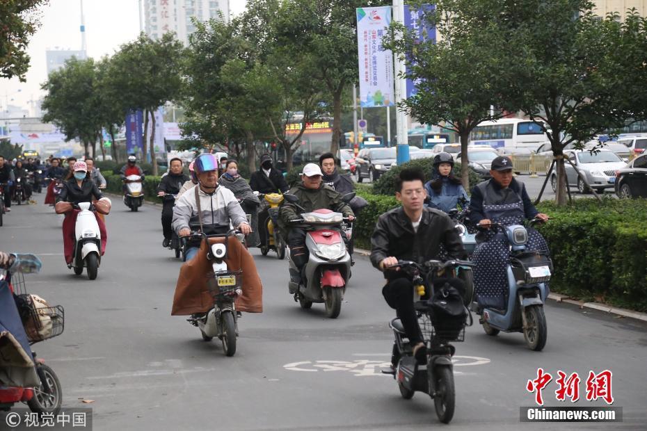 2018年10月9日,山东济南,昨日一场秋雨过后开始降温,今天清晨最低气温只有6度,马路上不少上班族穿上羽绒服骑车赶上班路。 图片来源:视觉中国