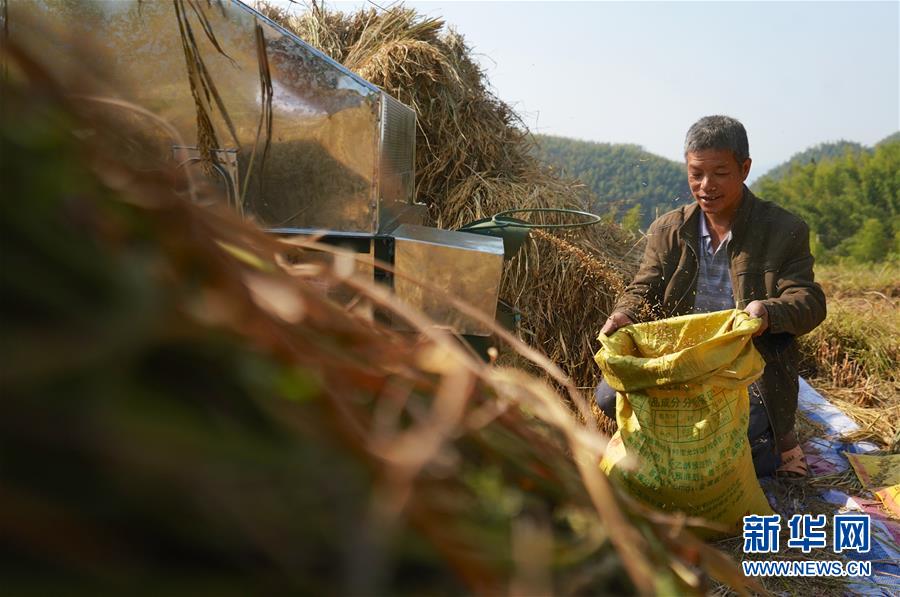 10月9日,一名村民在上堡乡的高山梯田利用机械进行脱粒装袋。 新华社记者 胡晨欢 摄