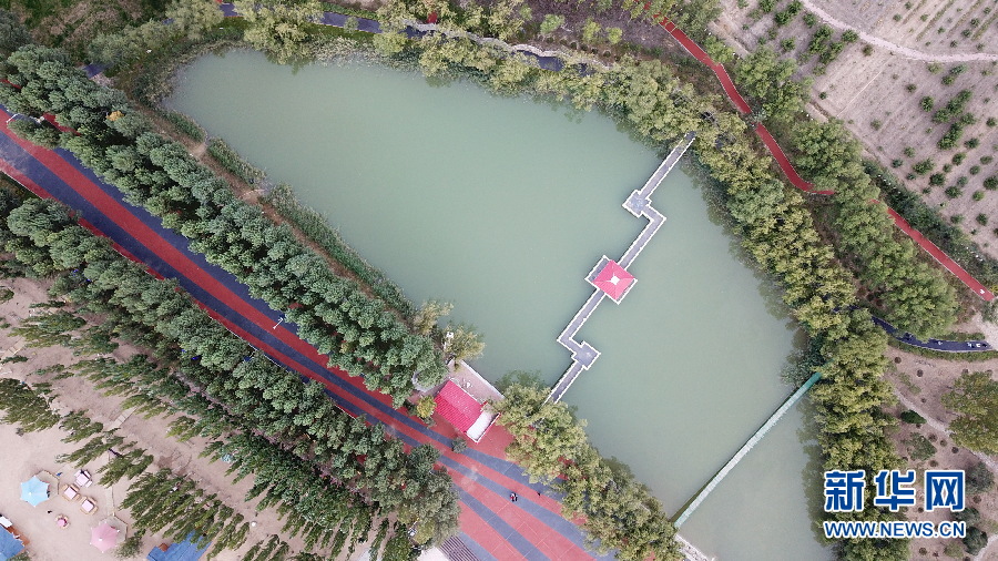 俯瞰恩格贝月亮湖。(新华网 王宇 摄)