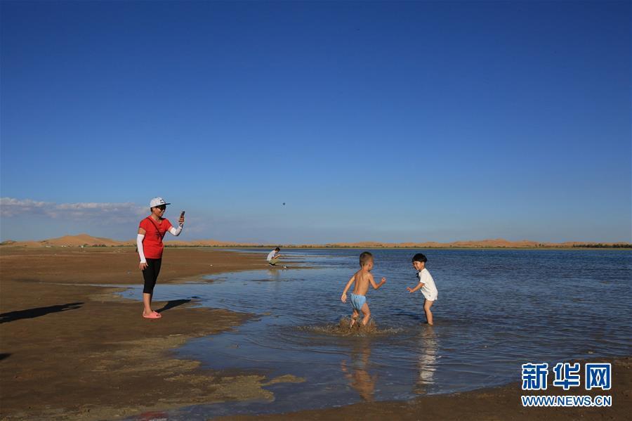 恩格贝月亮湖犹如镶嵌在沙漠绿洲里的一块碧玉。(新华网 王宇 摄)