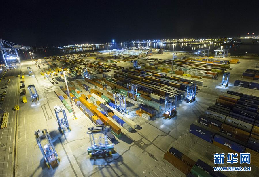 10月15日晚,在比利时泽布吕赫港集装箱码头,跨运车运送集装箱。 新华社记者 叶平凡 摄