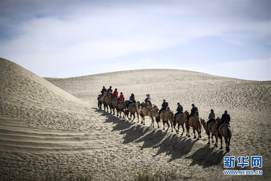 10月16日,游客在罗布人村寨里骑着骆驼游览。 新华社记者 赵戈 摄