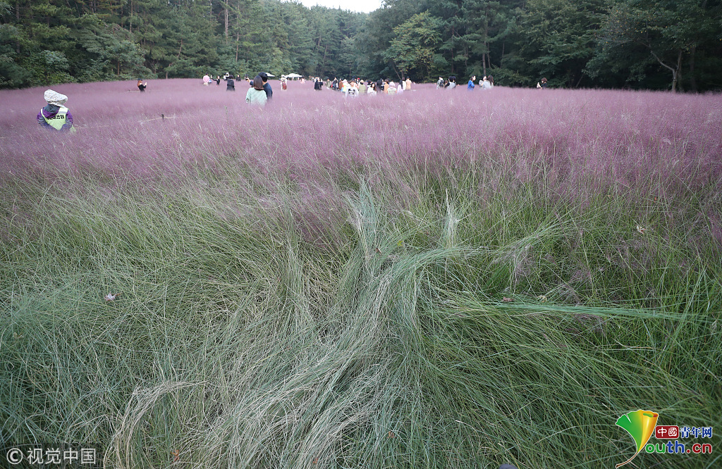 韩国蔚山,近日,蔚山公园大片粉黛乱子草盛开,但部分花海遭游客随意踩踏。公园并没有修复遭破坏区域,而是用绳索围起并挂上批判性告示,呼吁游客脚下留情。图片作者:Yonhap News Agency