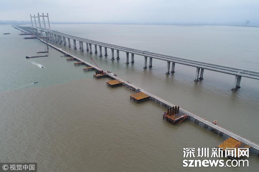 航拍福厦高铁泉州湾跨海大桥施工正酣