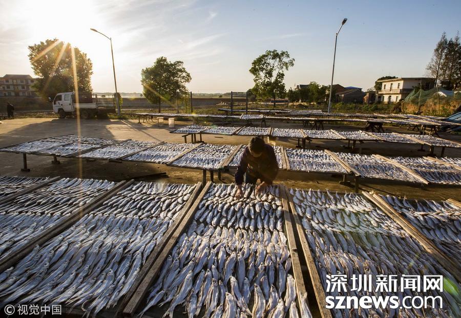 江西都昌县芗溪乡的渔民趁着晴好天气翻晒捕捞上岸的鱼虾。