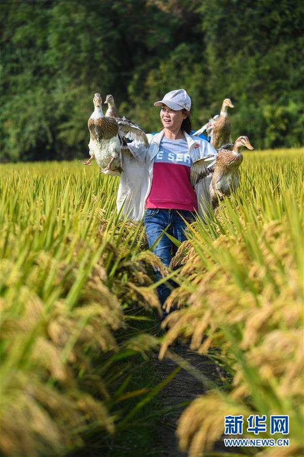 10月17日,种植基地负责人陈梅芳抓住几只稻田放养的鸭子。 新华社记者 徐昱 摄