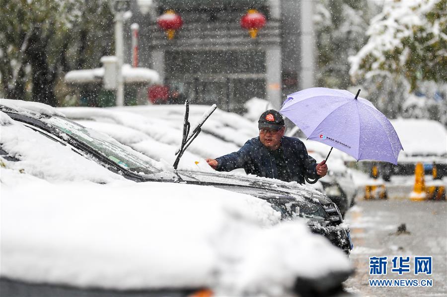 10月18日,乌鲁木齐市民在清理车上的积雪。当日,新疆乌鲁木齐迎来一场降雪。 新华社记者 江文耀 摄