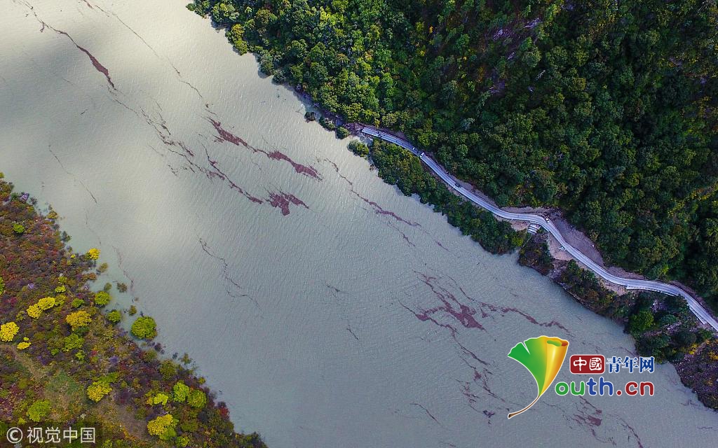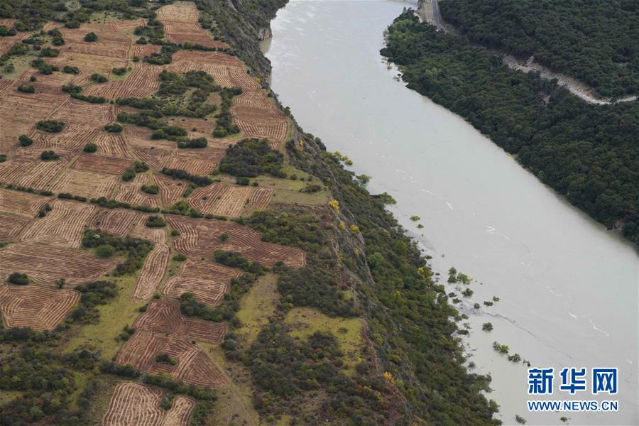 空中俯瞰通往加拉村已淹没的公路(10月18日摄)。 新华社记者 普布扎西摄