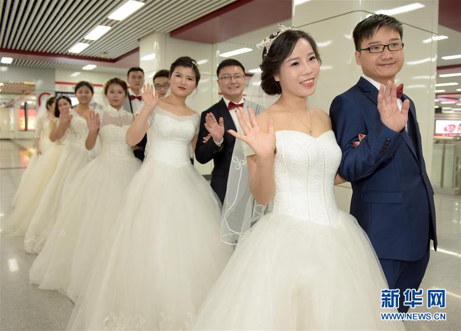 10月18日,在合肥市地铁一号线,新人们准备乘坐地铁。当日,中铁四局集团城市轨道交通工程分公司的18对新人在安徽合肥地铁一号线的车厢里举行了一场集体婚礼仪式。 新华社记者 郭晨 摄