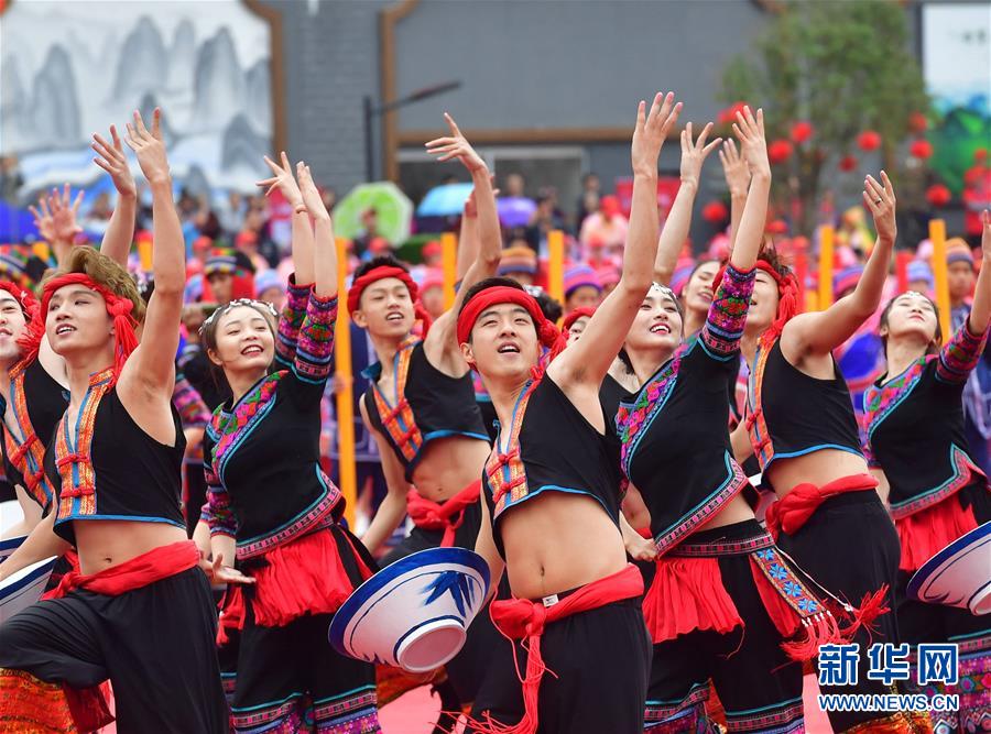 10月20日,各族同胞在广西大化瑶族自治县江滨文化广场表演节目,庆祝县庆。 新华社记者黄孝邦摄