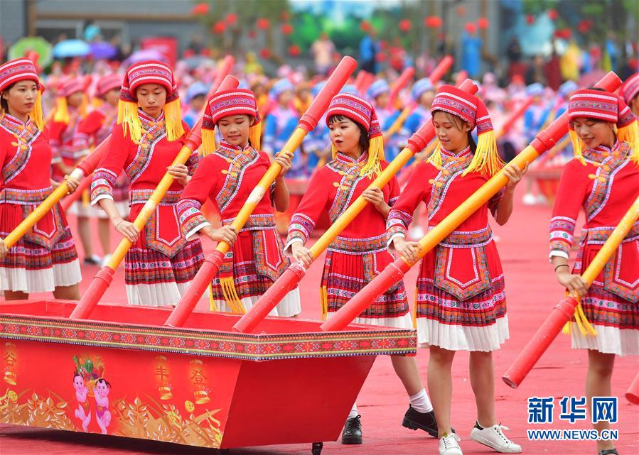 10月20日,各族同胞在广西大化瑶族自治县江滨文化广场表演节目,庆祝县庆。 新华社记者黄孝邦摄