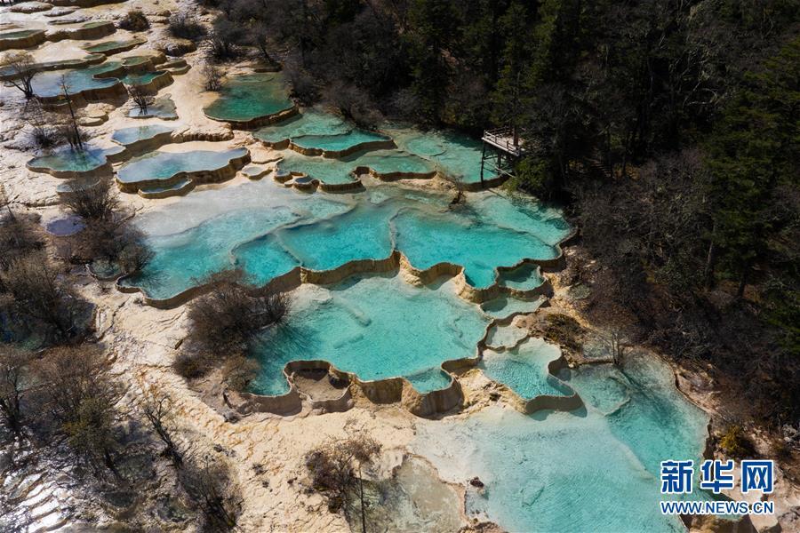 俯瞰黄龙沟争艳池一角(10月19日无人拍机摄)。深秋时节,在雪山、蓝天、白云和彩林映衬下,黄龙沟中的彩池色彩更加斑斓,目前黄龙景区进入观赏最佳时节。黄龙风景名胜区位于四川省松潘县境内,以彩池、滩流、雪山、峡谷、森林等闻名,享有“人间瑶池”“圣地仙境”之美誉。新华社记者 江宏景摄