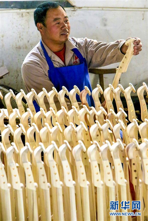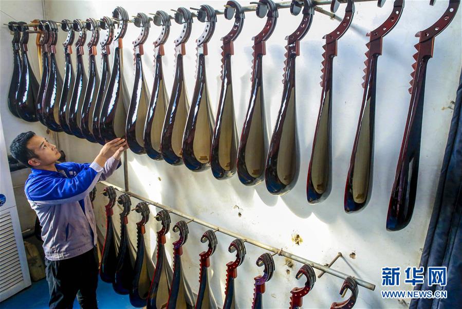 10月20日,在河北省饶阳县一家民族乐器厂,工人在加工产品。