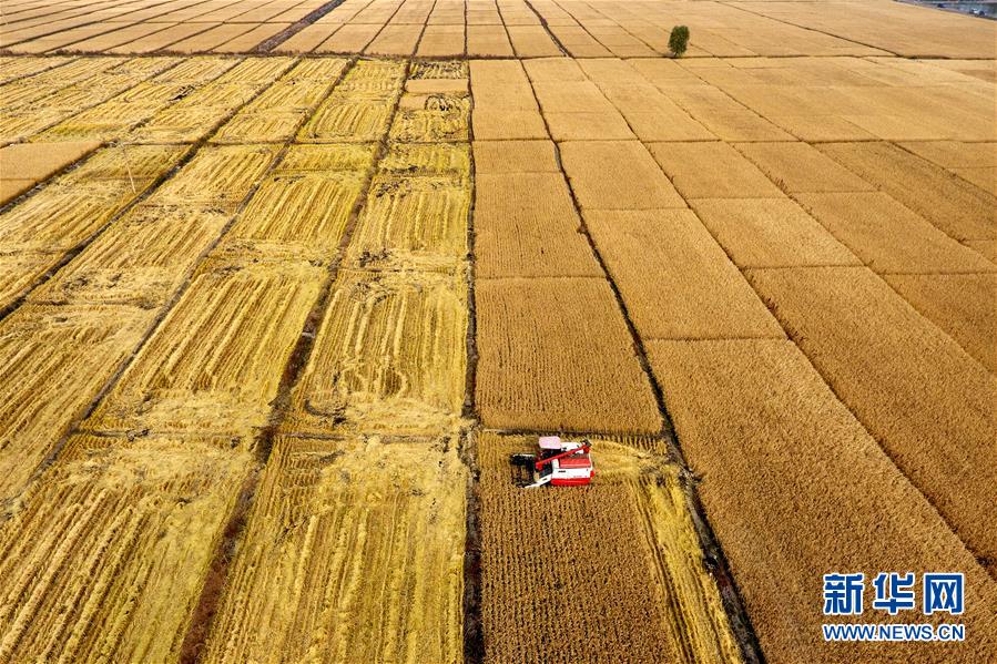 在太原市晋源区赤桥村,收割机在稻田里作业(10月17日无人机拍摄)。近日,山西省太原市晋源区2000多亩水稻迎来收割季。 金秋时节,农民们忙着收获成熟的农作物,喜迎丰收。 新华社记者 詹彦 摄