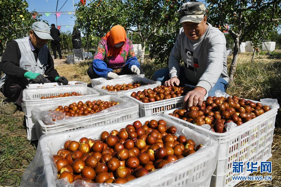 10月17日,在山东省青岛市即墨区蓝村镇王演庄北村,种植户在果园里收集采摘的大枣。 金秋时节,农民们忙着收获成熟的农作物,喜迎丰收。 新华社记者 李紫恒摄