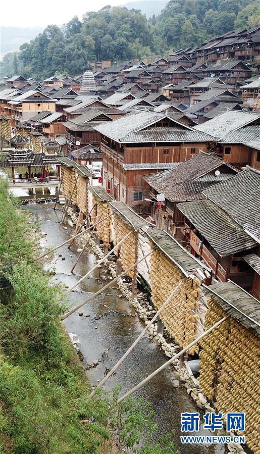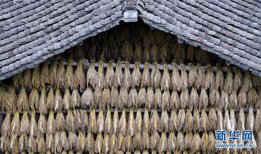 这是贵州省黔东南苗族侗族自治州从江县高增乡占里村一处屋檐下晾晒的稻谷(10月17日摄)。 金秋时节,农民们忙着收获成熟的农作物,喜迎丰收。 新华社记者陈晔华摄