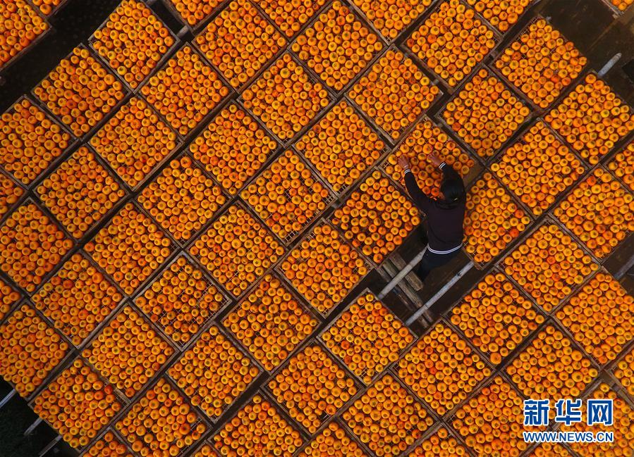 10月17日,广西桂林市平乐县沙子镇渡河村农民在晾晒柿子(手机拍摄)。 金秋时节,农民们忙着收获成熟的农作物,喜迎丰收。 新华社记者 黄孝邦 摄