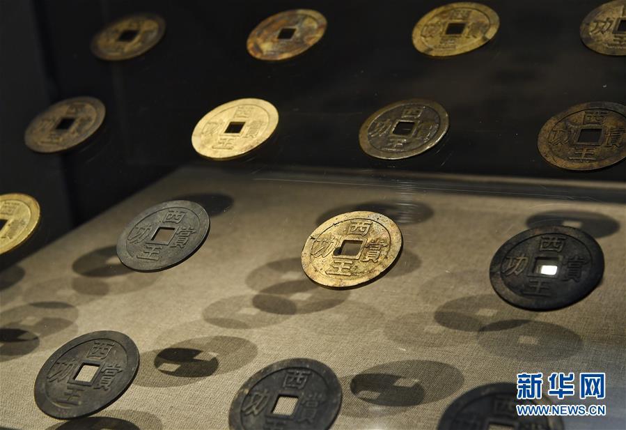 这是在四川博物院展出的“西王赏功”钱币(10月21日摄)。 当日,由四川省文化厅、四川省文物局、眉山市人民政府主办的“江口沉银——四川彭山江口古战场遗址考古成果展”在四川博物院开幕。此次展览共展出文物521件,展期将持续至2019年1月18日。四川彭山江口古战场遗址是2017年度全国十大考古新发现之一,共发现文物42000余件。 新华社记者刘坤摄