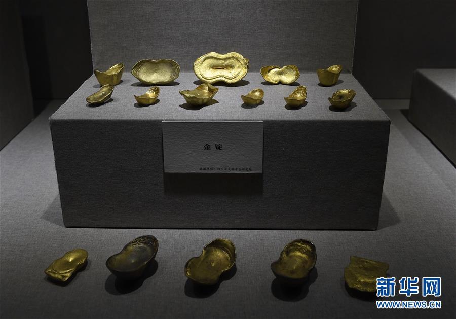 这是在四川博物院展出的金锭(10月21日摄)。 当日,由四川省文化厅、四川省文物局、眉山市人民政府主办的“江口沉银——四川彭山江口古战场遗址考古成果展”在四川博物院开幕。此次展览共展出文物521件,展期将持续至2019年1月18日。四川彭山江口古战场遗址是2017年度全国十大考古新发现之一,共发现文物42000余件。 新华社记者刘坤摄