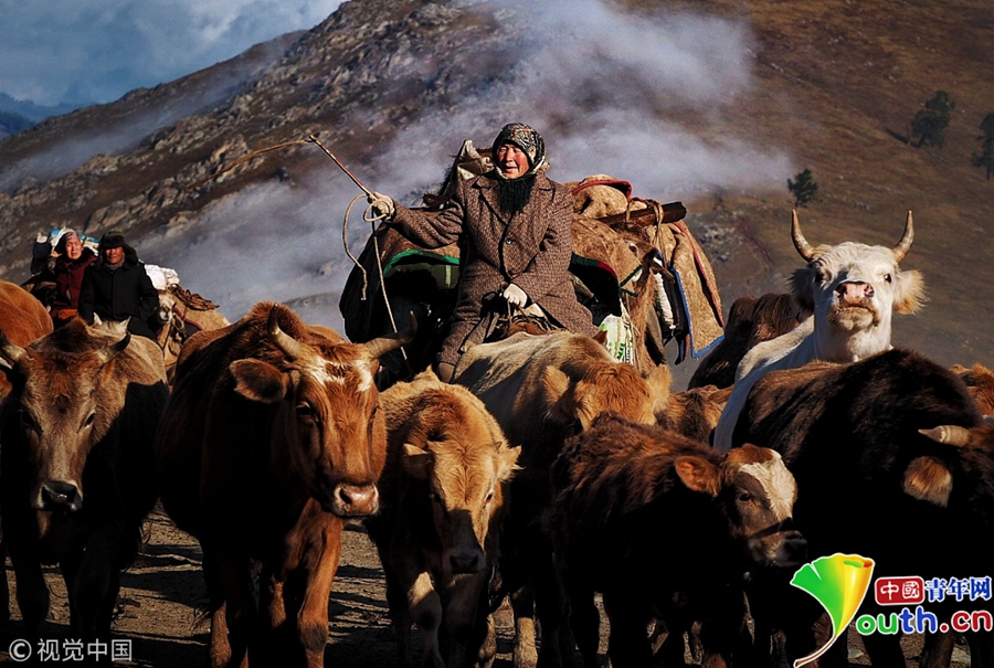 哈萨克族牧民赶着牛羊迁徙。