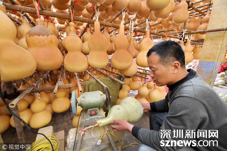 山西闻喜县礼元镇阜底村农民赵双慧对葫芦进行削皮处理。