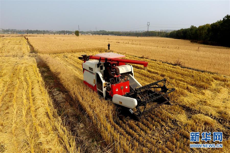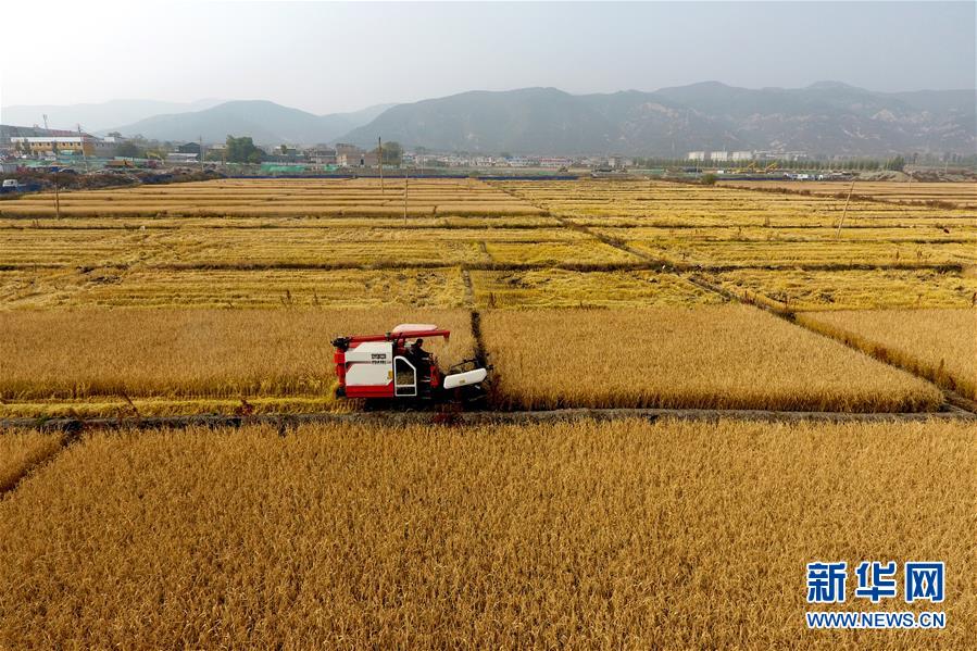 在太原市晋源区赤桥村,收割机在稻田里作业(10月17日无人机拍摄)。近日,山西省太原市晋源区2000多亩水稻迎来收割季。 金秋时节,农民们忙着收获成熟的农作物,喜迎丰收。 新华社记者 詹彦 摄