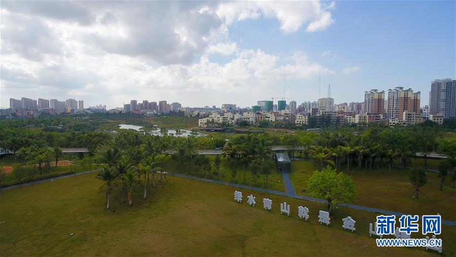 这是海口市美舍河凤翔湿地公园一角(10月22日无人机拍摄)。 海口市凤翔湿地公园内流水潺潺,绿草如茵。很难想象,这个市民游客休闲散步的好去处、具有强大污水净化功能的湿地公园,两年前还是臭气熏天、人们避之不及的垃圾堆填场。 把生态文明建设放到更加突出的位置,近两年来海口市以湿地城市建设为突破口,不断创新城市生态治理,着力改善生态民生,在生态文明建设上闯关探路。 新华社记者 杨冠宇 摄