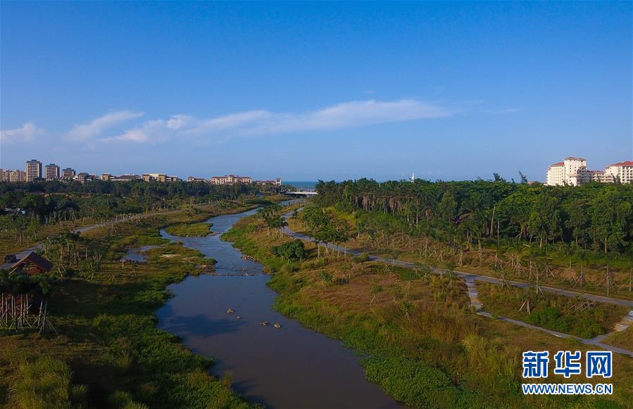 这是海口市五源河湿地公园一角(10月22日无人机拍摄)。 海口市凤翔湿地公园内流水潺潺,绿草如茵。很难想象,这个市民游客休闲散步的好去处、具有强大污水净化功能的湿地公园,两年前还是臭气熏天、人们避之不及的垃圾堆填场。 把生态文明建设放到更加突出的位置,近两年来海口市以湿地城市建设为突破口,不断创新城市生态治理,着力改善生态民生,在生态文明建设上闯关探路。 新华社记者 杨冠宇 摄