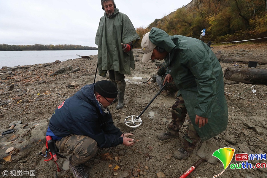 当地时间2018年10月25日,匈牙利布达佩斯,由于水位下降,考古学家在多瑙河畔发掘出大量16-17世纪古钱币和武器。据现场工作的考古学家说,这些宝藏来自一艘可能在18世纪沉没的商船。