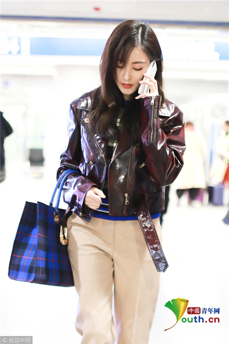 2018年10月25日,北京,张天爱现身机场,她身穿短款漆皮夹克时尚帅气,低头疾走打电话星范十足。