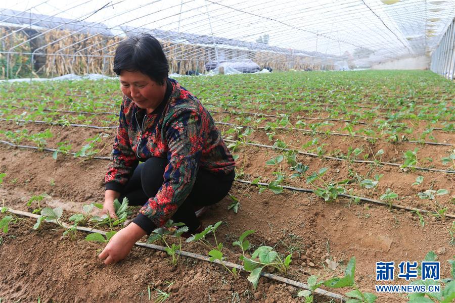 山东沂水县龙家圈街道寨里社区居民在草莓大棚内劳作(10月9日摄)。这里是由扶贫资金投资建设的草莓种植基地,也是山东临沂“四权分置”扶贫新模式的“试验田”。新华社记者 王南 摄