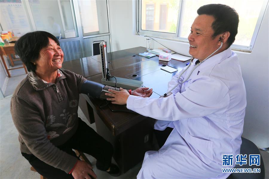 在山东蒙阴县云梦湖生态区东汶社区的农村幸福院养老院的医务室,医生为老人测量血压(10月11日摄)。2016年,东汶社区将原来的村两委大院扩建为农村幸福院养老院,委派专人负责老人们的一日三餐。同时按照“子女交纳、集体补助、社会捐赠、财政奖励”的模式设立孝心养老基金,每月定时发给贫困老人。新华社记者 王南 摄