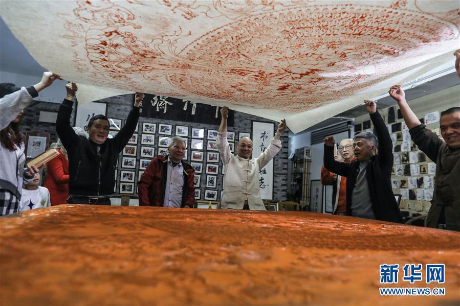 10月27日,魏立中(右四,着白上衣者)与嘉宾一起把宣纸水印作品从巨型雕版上轻轻抬起。