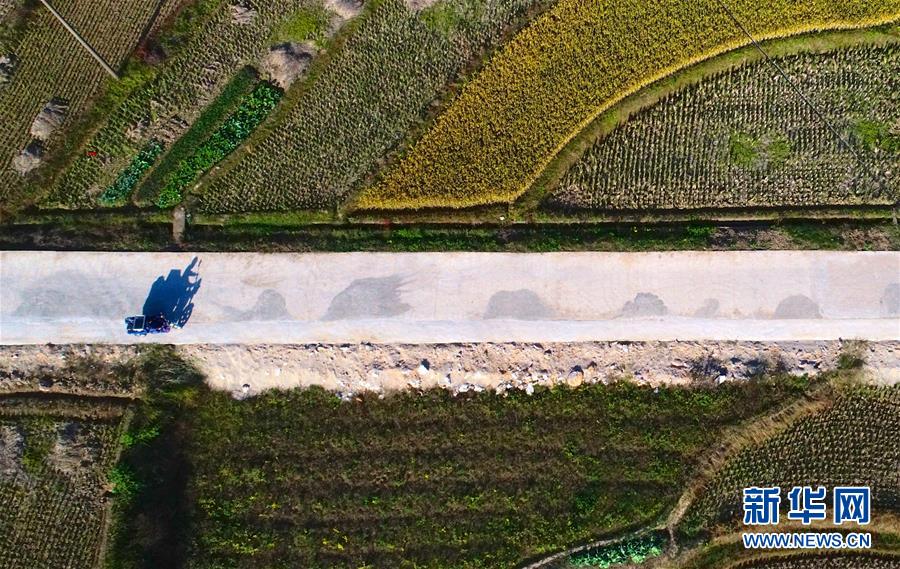 10月30日,曾纪连载着电影放映设备穿过稻田,准备为村民们放映电影(无人机拍摄)。新华社记者 胡晨欢摄
