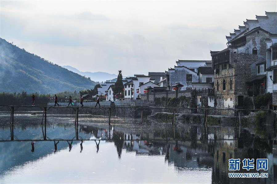 2018年10月17日,游客从河桥镇一木桥上走过。浙江省杭州市临安区河桥镇拥有1300多年的历史,镇范围内至今仍保留着100多幢古建筑。2018年2月,河桥镇成功创建浙江省小城镇环境综合整治样板镇。