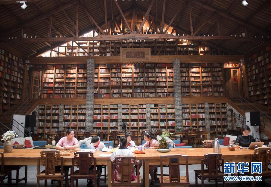 浙江省德清县莫干山镇庙前村小学生在“莫干山居图”民宿里读书(2018年5月29日摄)。2012年,在杭州从事出版业的朱锦东,想要回到从小生活的乡村,他租下莫干山镇庙前村废旧闲置的礼堂,将其改造成为一家书香四溢的民宿,起名为“莫干山居图”。他将琴棋书画引入居住空间,民宿在2015年开业后迅速打响了名气,目前年接待住客7000人次。新华社记者 翁忻旸 摄