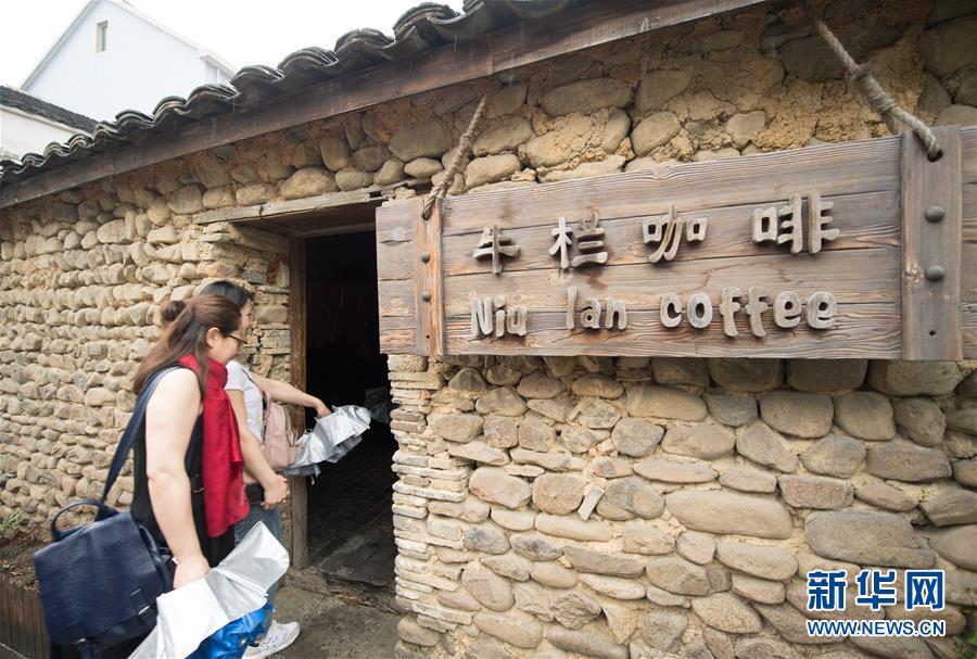 游客走进浙江省桐庐县江南镇荻浦村由牛栏改建的咖啡馆(2018年4月23日摄)。新华社记者 翁忻旸 摄