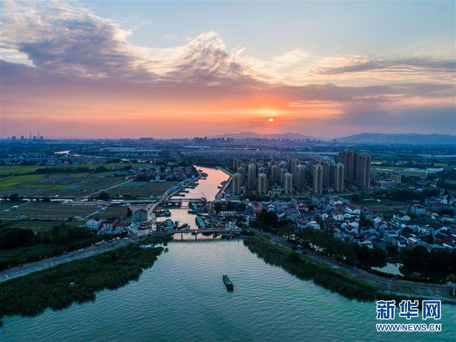 这是2018年9月27日航拍的夕阳下的新塘村。浙江省长兴县新塘村毗邻太湖,该村以蔬菜种植、水产捕捞为主导产业,素有“浙北水产第一村”之称。新华社记者 徐昱 摄