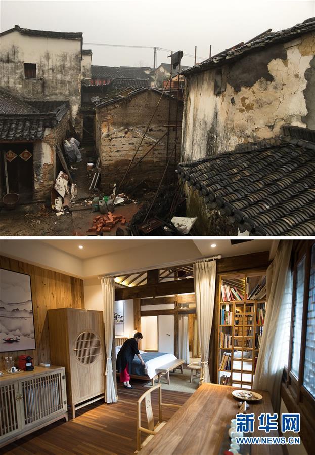拼版照片,上图为浙江省桐庐县江南镇深澳村“三生一宅”民宿改建前破旧的民房;下图为工作人员在整理浙江省桐庐县江南镇深澳村“三生一宅”民宿房间(2018年4月23日摄)。 新华社记者 翁忻旸 摄