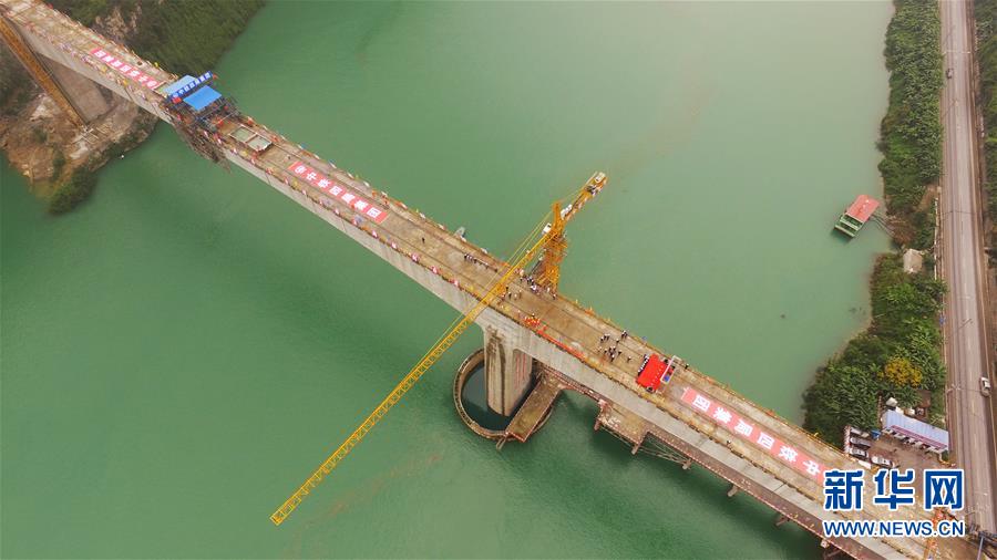 10月23日,在重庆涪陵,施工人员在渝怀铁路涪秀二线重点工程——乌江右线大桥主跨合龙现场作业。 当日,由中铁四局承建的渝怀铁路涪秀二线重点工程——乌江右线大桥主跨成功合龙,标志着大桥主体工程全部顺利结束。乌江右线大桥项目全程460.1米,主跨192米,跨越乌江和319国道。在两年多的建设过程中,施工人员攻克了“不等高墩”“不对称边跨”“边跨入隧”等多个技术难题。 新华社记者王全超摄