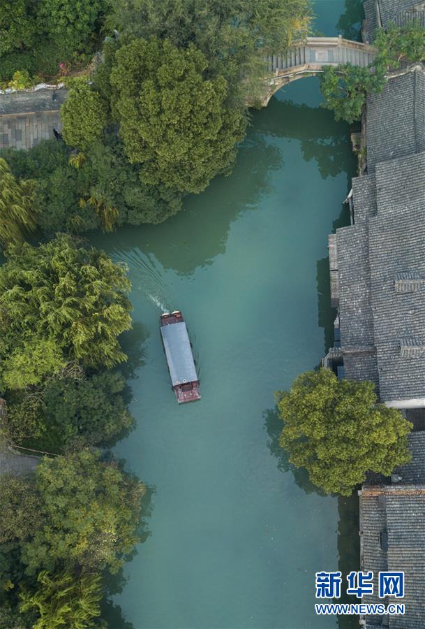 10月18日,一艘游船行驶在乌镇水道上(无人机拍摄)。新华社记者翁忻旸摄