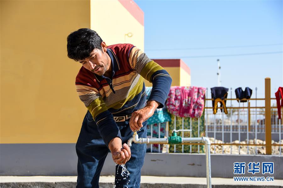 买合肉甫·木拉吧在庭院里洗手。相较于去河里取水,新城里的自来水大大方便了生活(10月28日摄)。新华社记者 关俏俏 摄