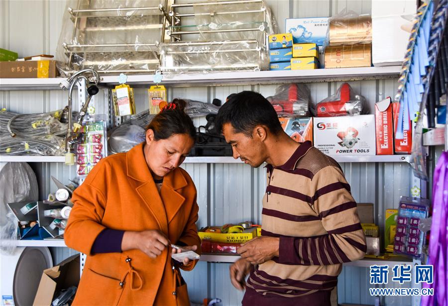 在位于泽普县桐安乡的建材铺里,热娜古丽·喀尔曼(左)跟前来购买建材的顾客交谈(10月28日摄)。 新华社记者 关俏俏 摄