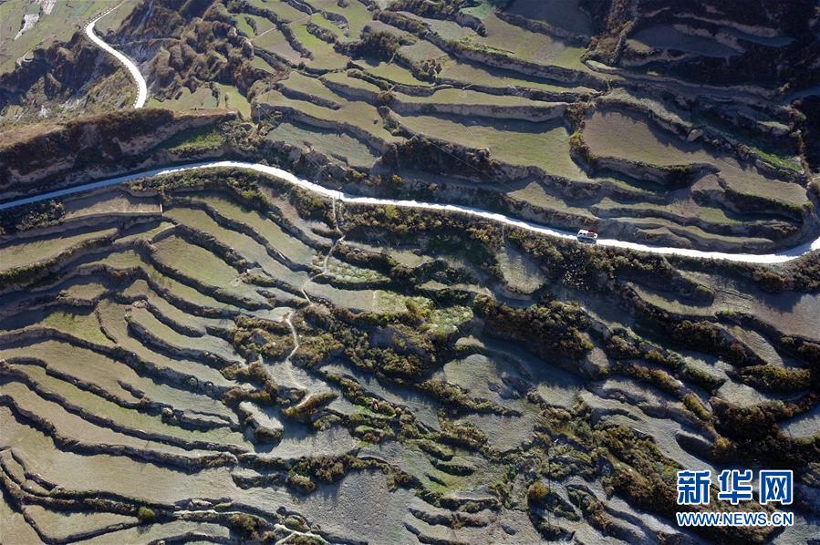 在陇南市武都区坪垭藏族乡,载有村民物品的搬迁车辆行驶在山间道路上(10月31日无人机拍摄)。新华社记者 范培珅摄