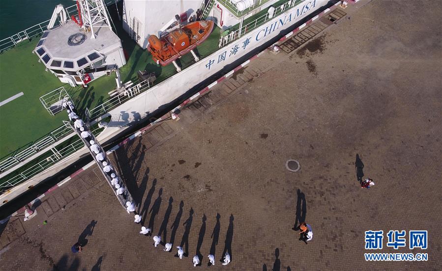 11月3日,海事执法人员登上“海巡21”轮(无人机拍摄)。当日,随着“海巡21”轮缓缓驶离海口海事监管基地码头,由琼桂粤海事部门共同开展的琼州海峡、北部湾及环海南岛水域跨辖区联合巡航执法活动揭开序幕。新华社记者杨冠宇摄