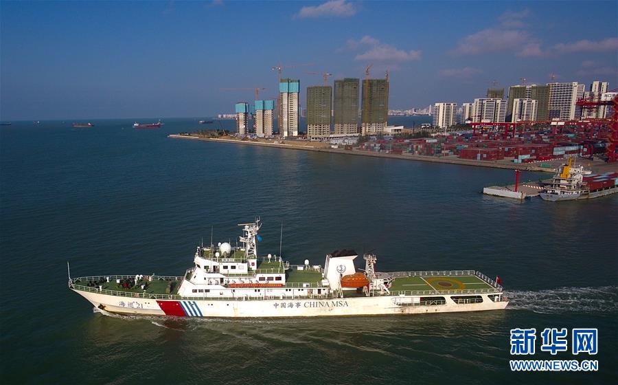11月3日,“海巡21”轮驶出港口。当日,随着“海巡21”轮缓缓驶离海口海事监管基地码头,由琼桂粤海事部门共同开展的琼州海峡、北部湾及环海南岛水域跨辖区联合巡航执法活动揭开序幕。新华社记者杨冠宇摄