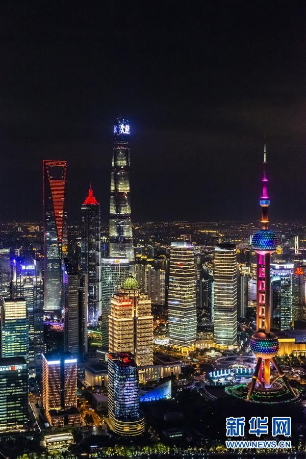 这是11月2日拍摄的上海浦东建筑群夜景。 首届中国国际进口博览会即将在上海开幕。美丽的上海张开怀抱,迎接八方来客。 新华社记者 沈伯韩 摄