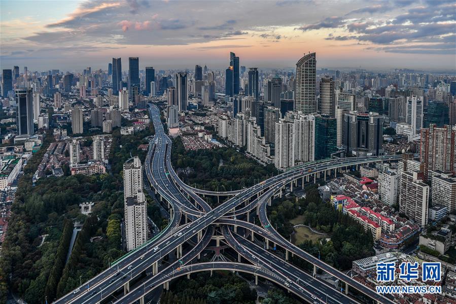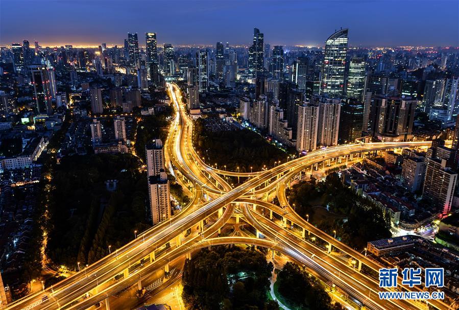这是11月2日拍摄的上海延安高架路与南北高架路交汇处的立交桥。 首届中国国际进口博览会即将在上海开幕。美丽的上海张开怀抱,迎接八方来客。 新华社记者 李鑫 摄